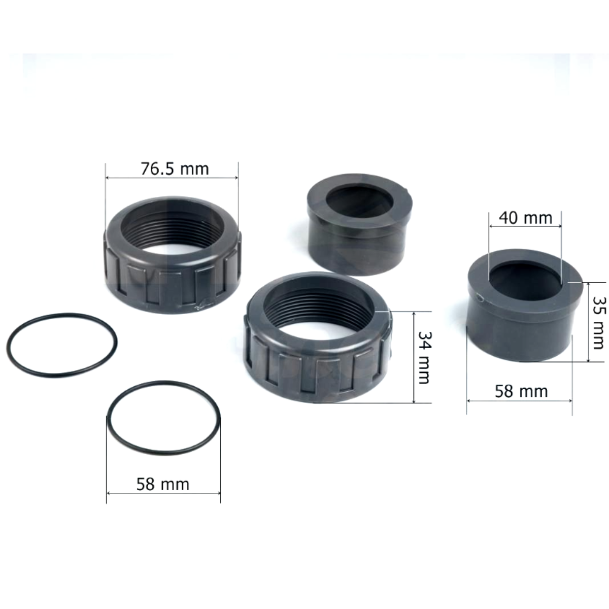 Bocchettoni completi di ghiera, manicotto e guarnizioni per l’esntrata e l’uscita della pompa Astralpool riferimento Sena.