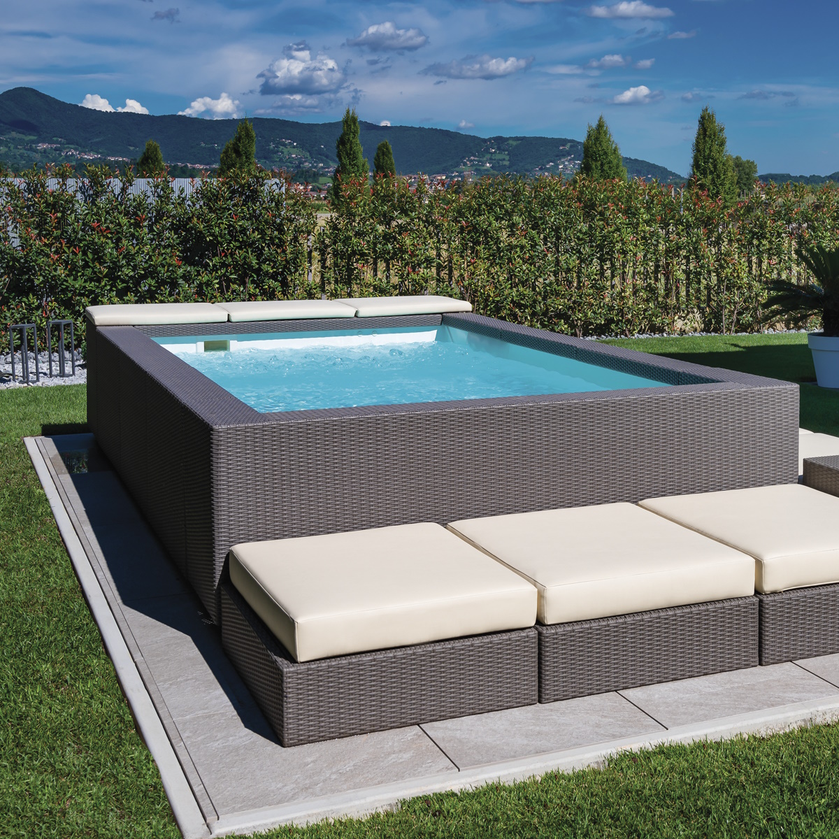 Completa con stile la tua minipiscina Playa con il Cuscino Living. Disponibile in Natural, Brown, Grey e Water, si abbina perfettamente al design elegante della tua oasi di relax.
