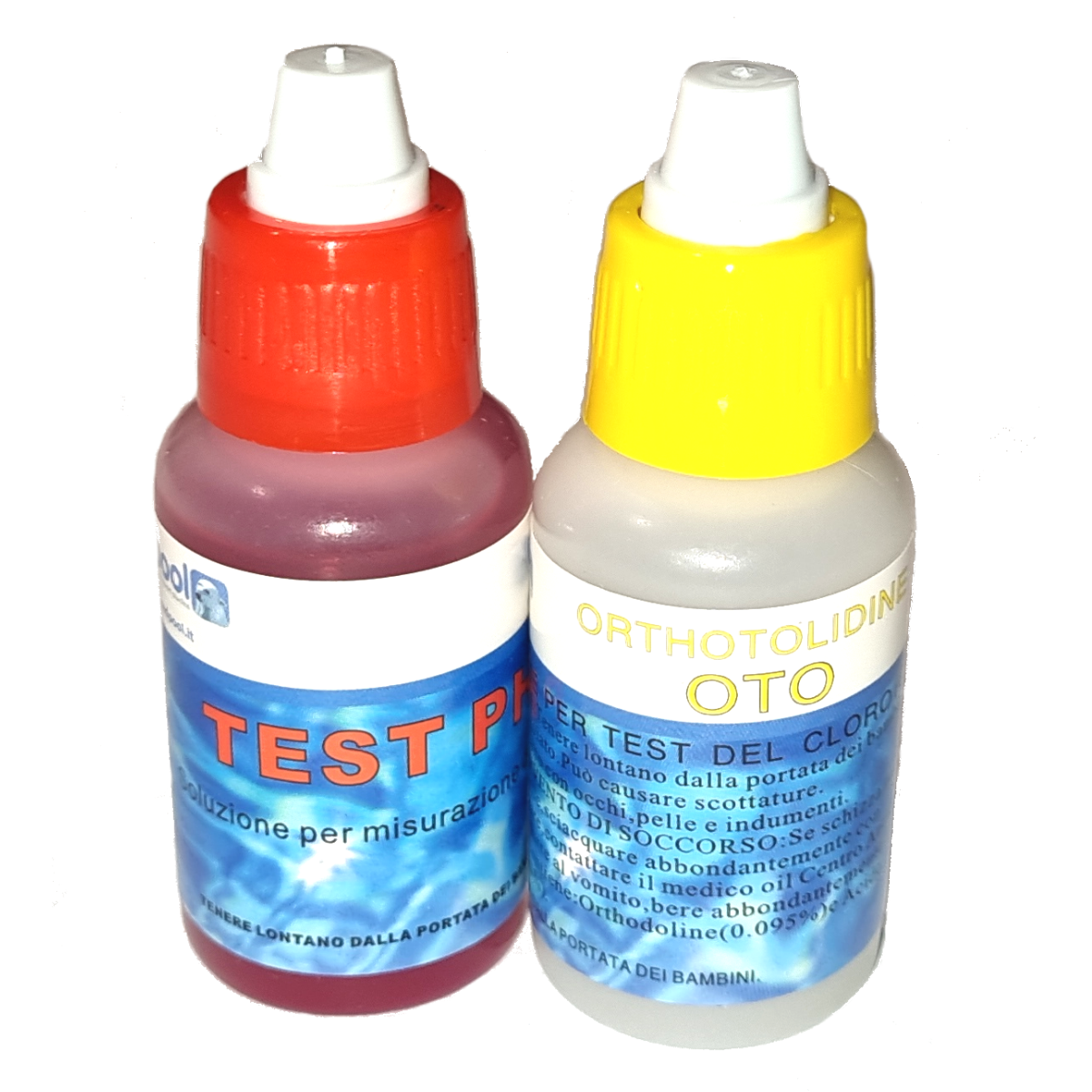 Ricambi per test manuale in goccie, composto da due bottiglie da 20 ml, una per la misurazione del Cloro e l’altra per i parametri del PH.