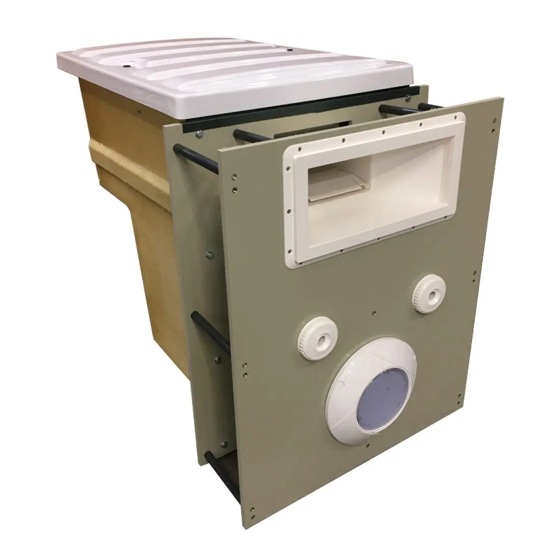 Il muro filtrante Filtrinov GS14 viene istallato direttamente sulla parete della piscina, tutto il necessario per il ricircolo e la filtrazione dell’acqua, l’illuminazione e le varie predisposizioni possibili (dosaggi automatici, riscaldamento ecc.) possono essere gestiti in quel punto.