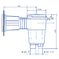 Tutti gli skimmer sono forniti con guarnizioni adesive, flange e viti, sono stati progettati con dei trattamenti UV nelle parti che non rimangono interrate. Fabbricati in ABS bianco, con battente flottante e calotta per regolazione della portata. Attacco inferiore di aspirazione: filettato interno 11/2”, esterno 2”.