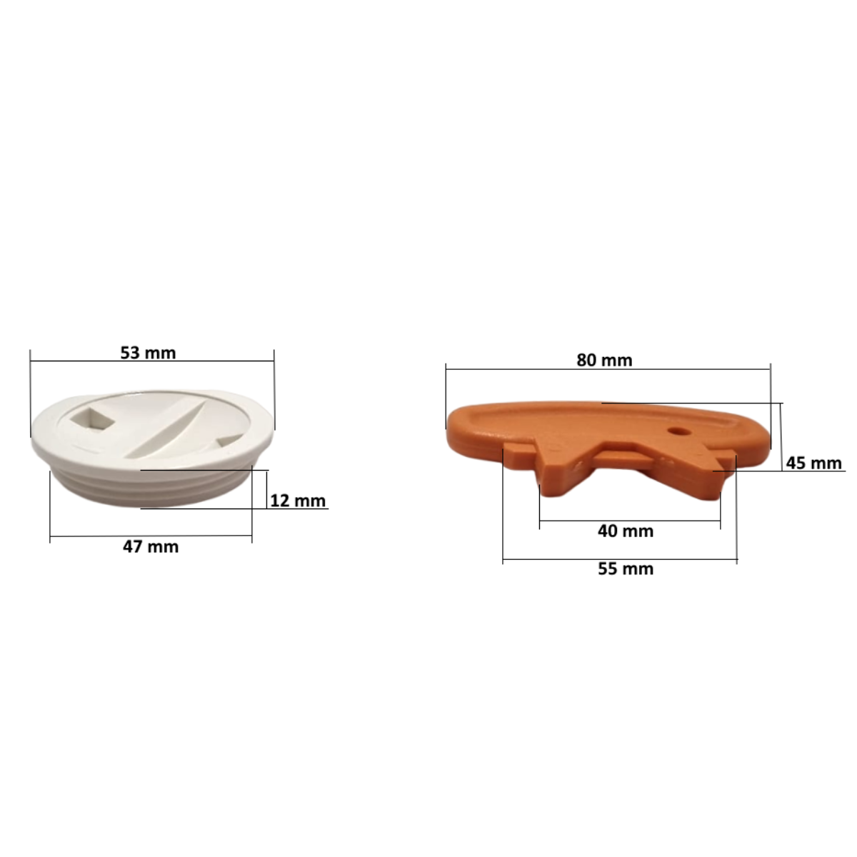 Tappo di chiusura e chiave di serraggio per le bocchette aspirafango o vacum Astralpool.